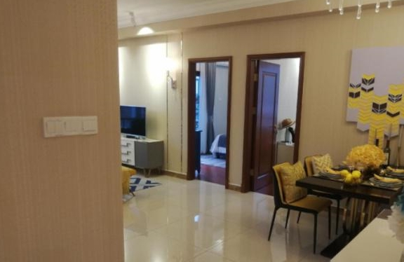 虽然样板房也是瓷砖地板,不过墙上多了墙纸,天花板多了灯带吊顶。最主要是家具入户,软装都很到位。