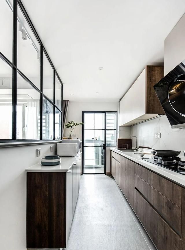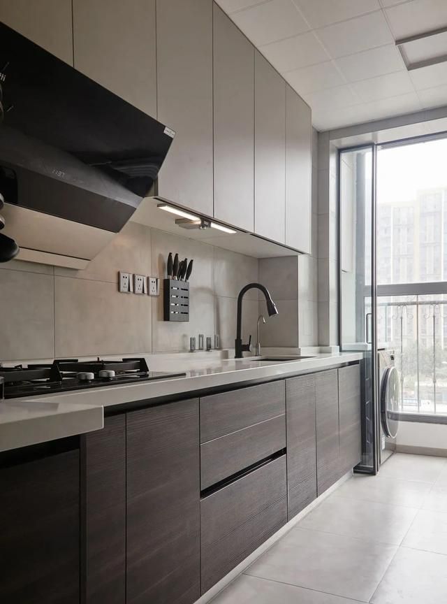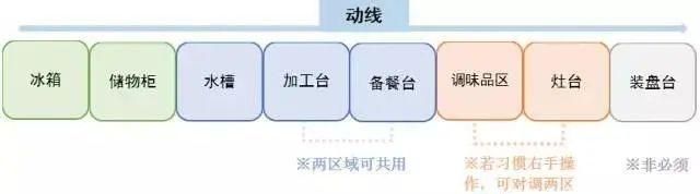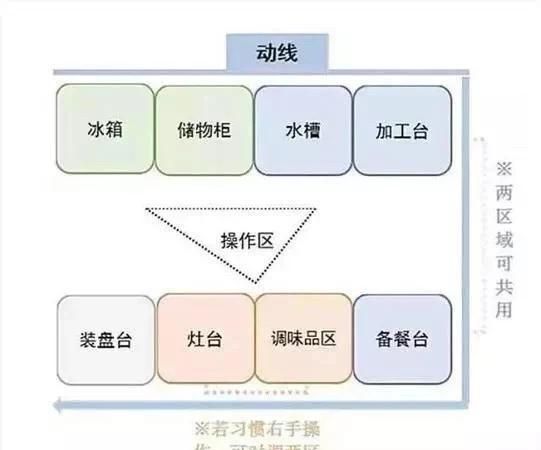 比如一字型厨房里,操作台一字排开,主要功能区应比较集中,往左右走一两步即可完成大部分工作是最好的。