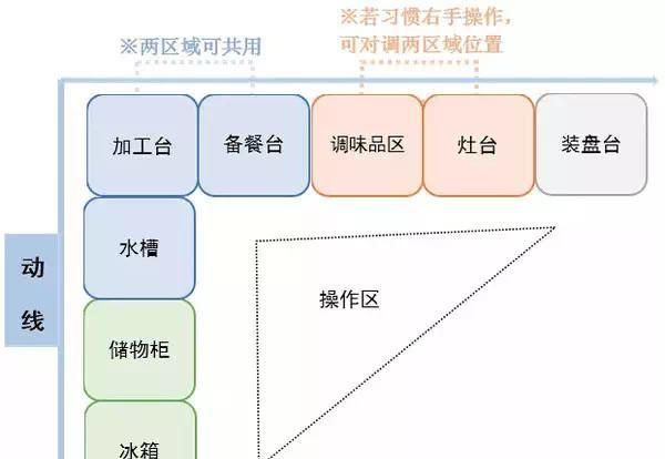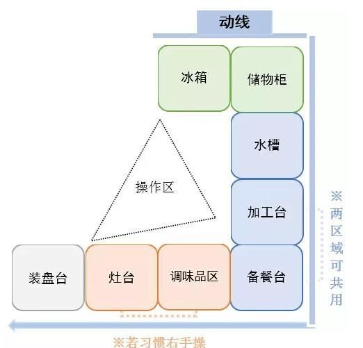 而在L型、二字型和U型厨房里,尽量设计出三角形动线,也是让功能区变得集中,并且能在最短的路线中完成更多的工作。
