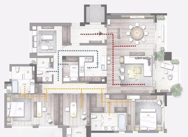 大致确定空间布局之后,一定要保证走动路线是最短的。尽量不要设置会造成绕路的家具设施,否则长此以往,非常影响居住体验(尤其是家务动线)。