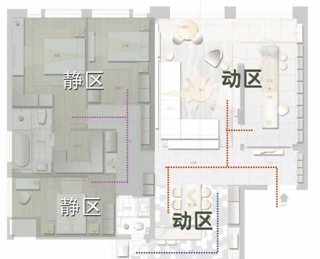 先简单介绍一下动区和静区,其实很简单,访客动线里包含的空间就是动区;家人动线的空间就是静区。