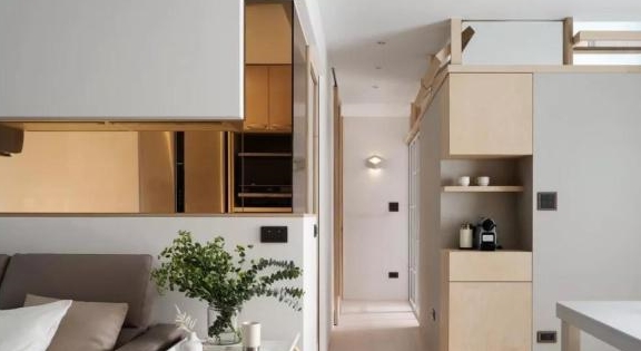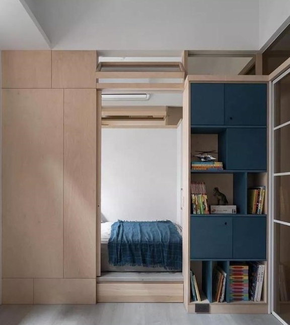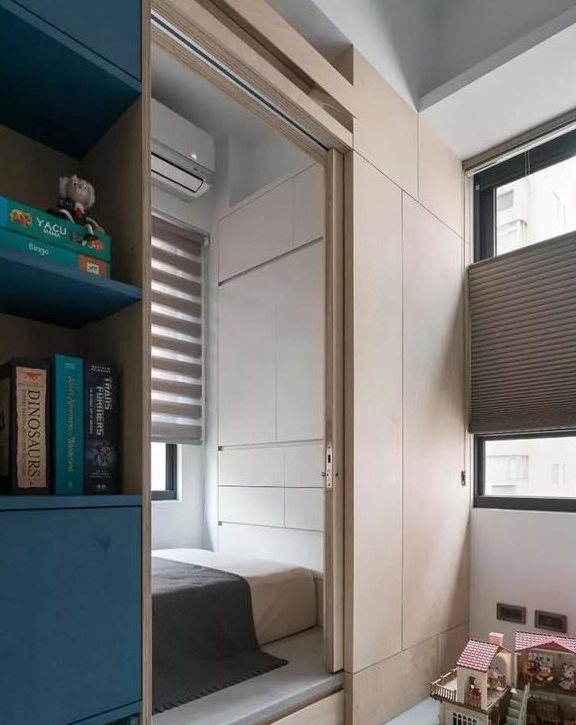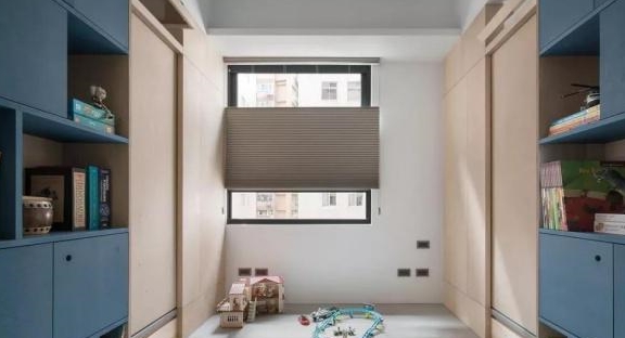 来看次卧儿童房的具体效果。整个空间一分为三,以中间的儿童游乐室为中轴,左右两边各隔出一间卧室,这样两个孩子不仅有了嬉戏的地方,睡觉与休息的地方也一并简洁,当真是是太过机智。且游乐室还可以作为储物间,书房等等,非常实用。