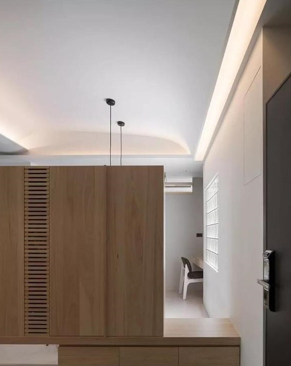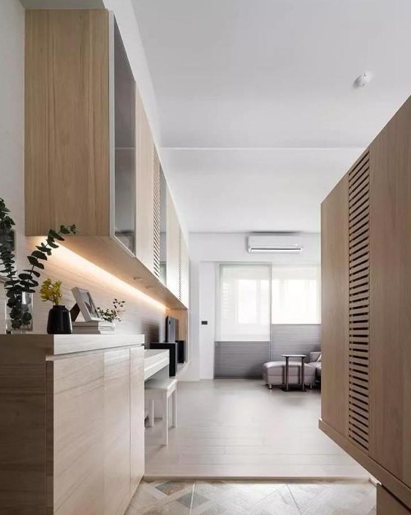 来看实景。这个是入户,其实最初是没有独立玄关空间的,考虑到实用性,就在对面多了错层式鞋柜,不仅开辟出了独立空间,还能更好的方便纳鞋,很实用。