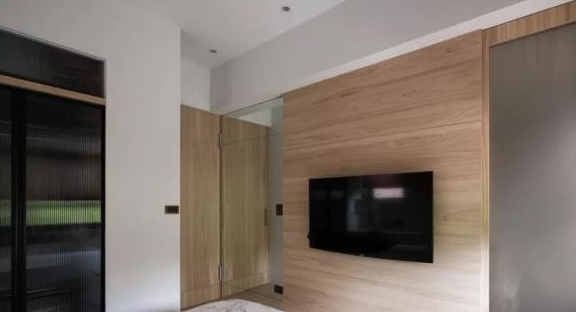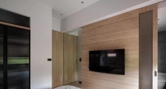 换个方向,可以看到床尾背景墙,选用木饰面装饰,效果简约自然,再搭配壁挂式电视,休息时看个节目也是不错的选择,至于右侧,则是主卫房门。