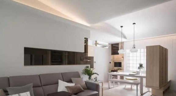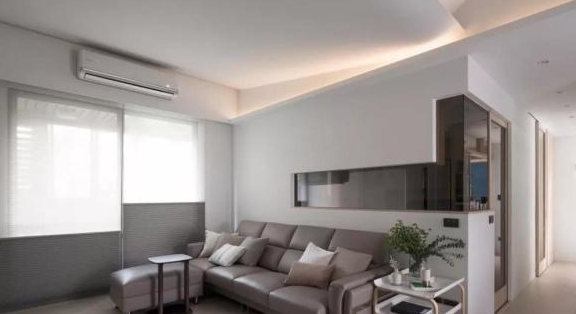 入户进来,就是业主家的客厅了,这一面主要是沙发墙,其装修效果很简洁,顶面是几乎不加装饰的白墙,搭配地面木色的地板,效果稳重大方。为了不让沙发墙显得单调,从右侧厨房门处延伸出镜面玻璃造型,效果既简洁又炫酷。另外,这里可以发现阳台门挺特别的,上面是类似透光的磨砂玻璃材质,而下面则是不透光的材质,并与简约的皮质沙发相呼应,其设计非常巧妙。