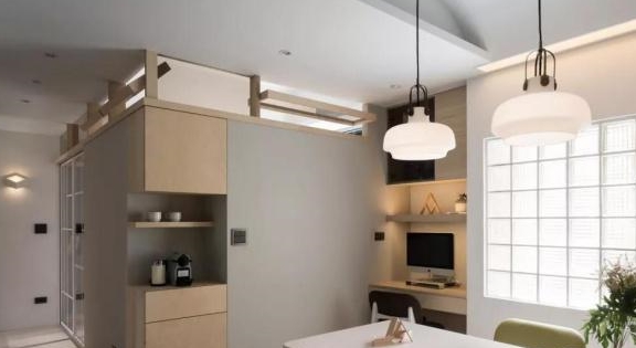 换一个方向,可以看到简洁的白色餐桌,效果清新文艺,不管是吃饭还是临时学习都可以搞定,毕竟对面墙角还布置了一个办公区。至于左侧靠过道的墙体做了餐边柜,用来辅助收纳正好,右边则是用来采光的白色窗格,很漂亮。不能忽视还有对墙的顶部空间,上面开了几扇窗,正好可以方便儿童房通风和透气。