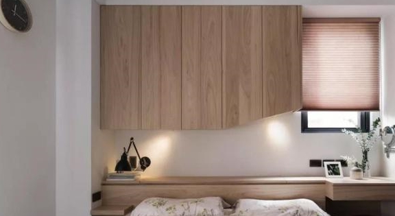 这个是床头墙,安装了吊柜,既起到了装饰作用,又能辅助收纳,很实用。并且吊柜底部嵌有筒灯,这样晚上看个书什么的也方便多了。右侧的话,其实可以作为一个小小的梳妆台。