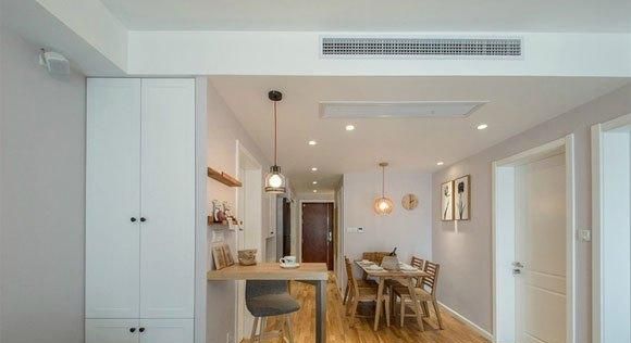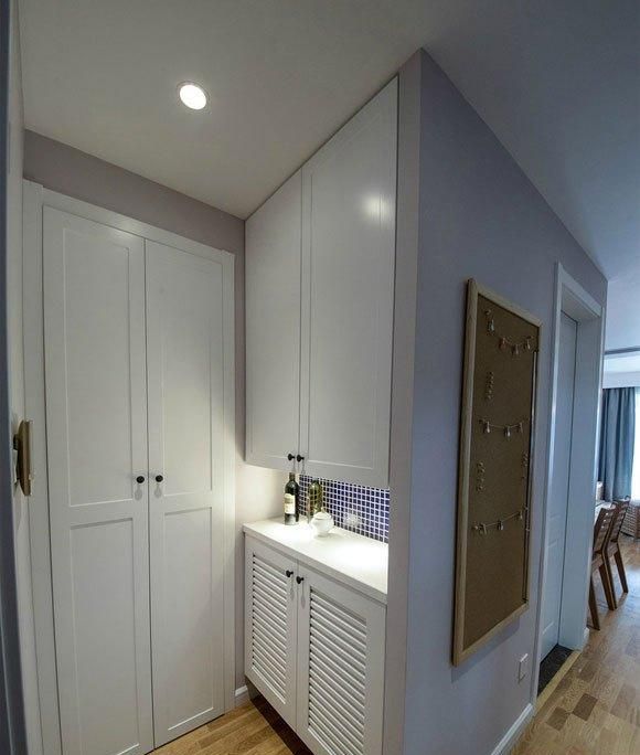 进门处的过道,定制了嵌入式的白色鞋柜,鞋柜的底部留空,配合百叶窗柜门,保持柜体内通风换气,避免异味的积聚。墙面还安装了挂钩,点缀墙面的同时也非常实用。