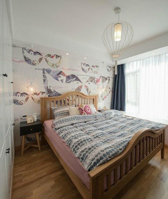 主卧室的装修效果,面积十分紧凑,床头背景墙采用带图案的墙贴来设计,搭配原木色实木床架,营造出格外温馨又不失设计感的睡眠环境。