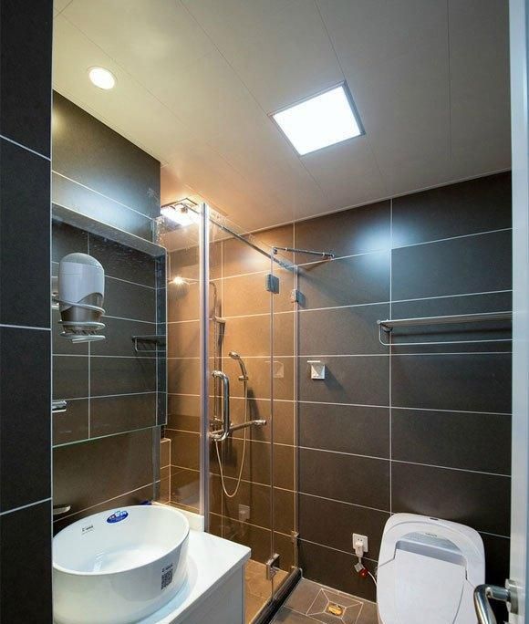 白色与灰色搭配的卫生间,面积虽然不大,却用玻璃墙隔出了独立的淋浴区,干净清爽又特别实用的卫生间装修方式。