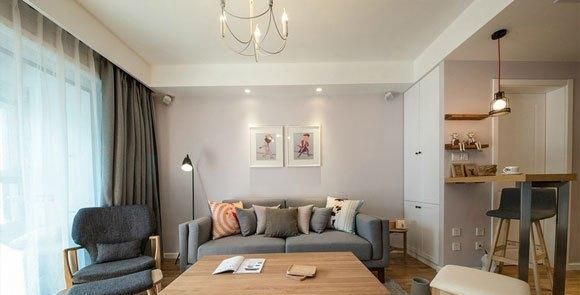 客厅的面积十分狭小,整体的硬装非常简洁。地面采用木地板来装饰,墙面刷上淡灰色乳胶漆,没有安装吊顶,却搭配了一盏烛形吊灯,这样的搭配设计简洁清爽,家居氛围也非常温馨。