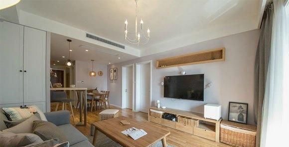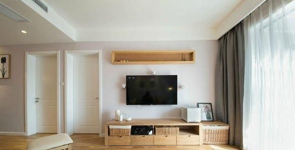 简约风格设计的客厅,电视背景墙没有过多装饰,顶部安装了原木色小吊柜,底部摆上一张造型简洁的原木色电视柜,不华丽也不大气的家却让人感觉特别轻松。