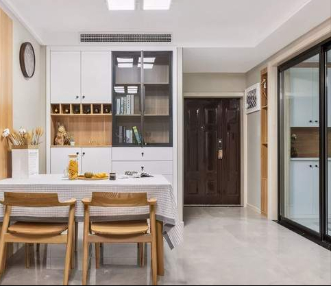 入户有个狭小的玄关走廊,无法定制鞋柜,因此,设计师在玄关右转处定制一个嵌入式的餐边柜,整合了玄关鞋柜的基本功能。