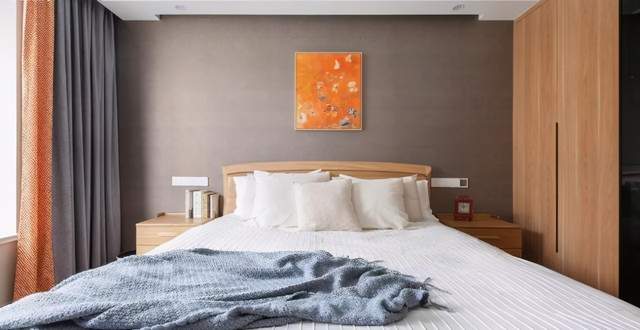 主卧家居配置依然以原木风为主,搭配浅咖色的背景墙和橘黄色的挂画,宁静中不失沉稳大气,营造出轻松舒适的休憩氛围。