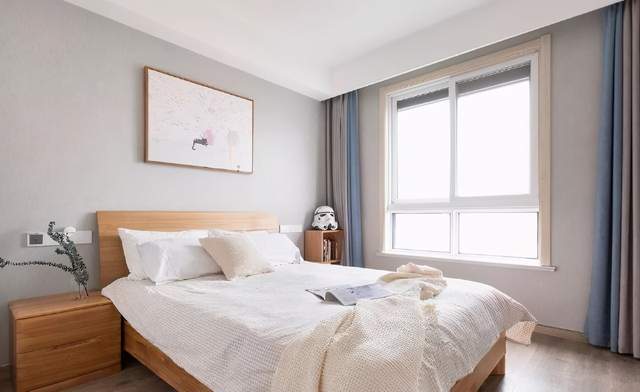次卧是儿童房,布置的非常清新舒适,浅灰色+原木色、白色的整体空间,清浅中不失舒适自然,为孩子营造出一个安静健康的生活氛围。
