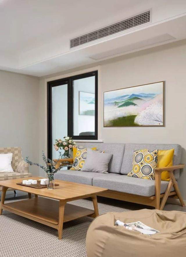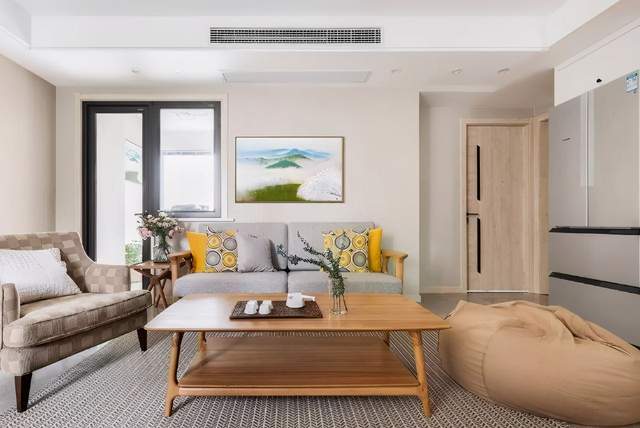 客厅在餐厅右转的区域,整体铺设了浅灰色棉麻地毯做区域分隔。浅灰色的实木扶手的布艺沙发,与一个法休闲沙发和懒人沙发搭配,中间摆放一个实木茶几,舒适大气而有围合感。