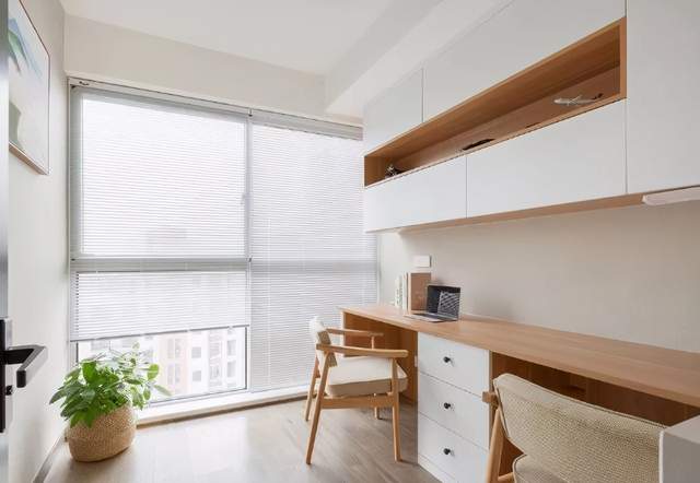 书房是男主人的最爱,依然布置得清新明亮,宽敞的双人工作台、抽屉隔断+封闭式书柜、开放格,满足家人同时工作、学习的需求,营造出安静清新舒适的空间氛围。