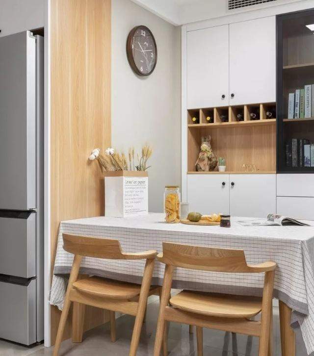 到顶的白色餐边柜有藏有露,除了餐具、餐具等收纳,兼具酒柜和书柜功能,也让餐厅功能变得更多元。旁边转角通向客厅处的储物柜还嵌入冰箱,方便就餐时取用饮品二孩水果等。