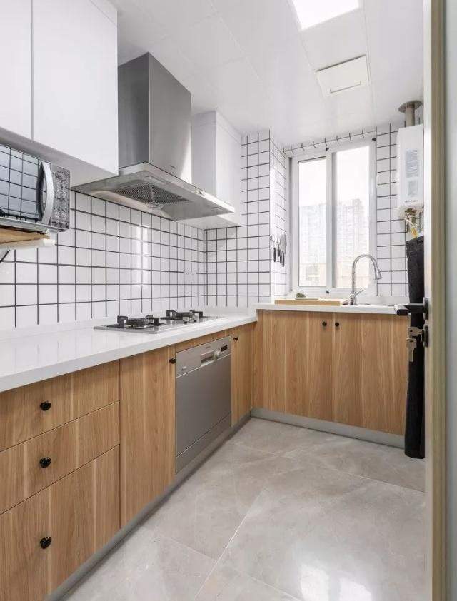 厨房在玄关左侧位置,白色小方砖搭配原木色L型橱柜和浅灰色的地面,清新时尚舒适,不但收纳空间充足,操作空间也十分宽敞,可以满足一家人烹饪操作的需要。