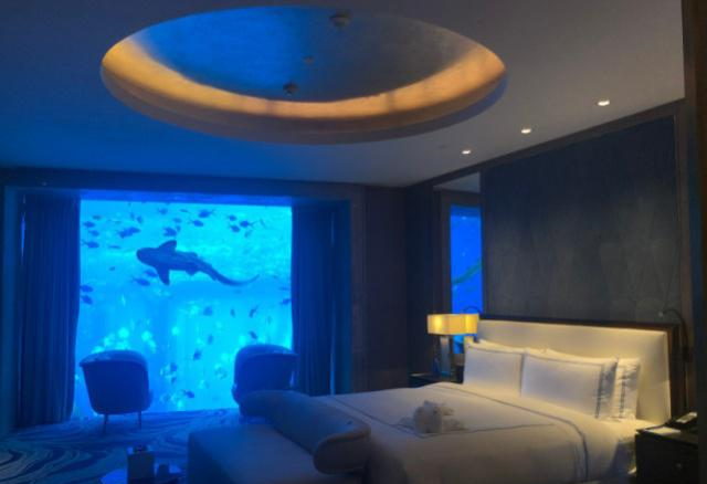 如果你想住更高端的房间,5万-10万一晚的水底套房也是你“制造浪漫”的最佳利器。108888元一晚的,名为波塞冬水底套房,这是全度假区最贵的房间。这是个340平米的超大客房,86000尾海洋精灵摇曳在你周围,满眼环绕你的全是海洋生物。