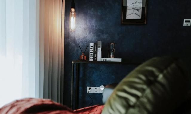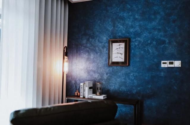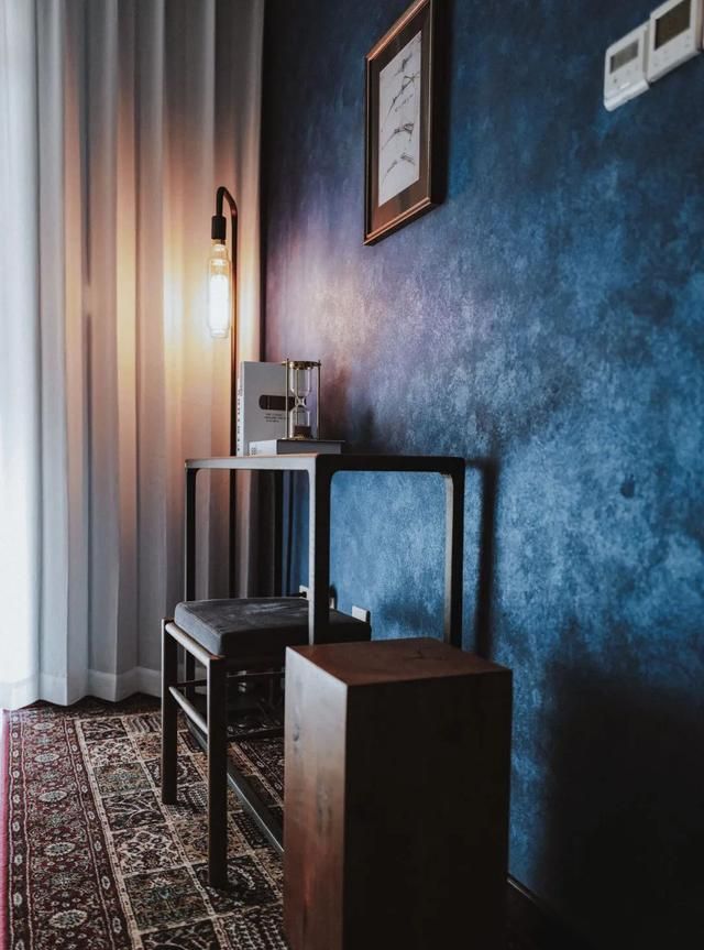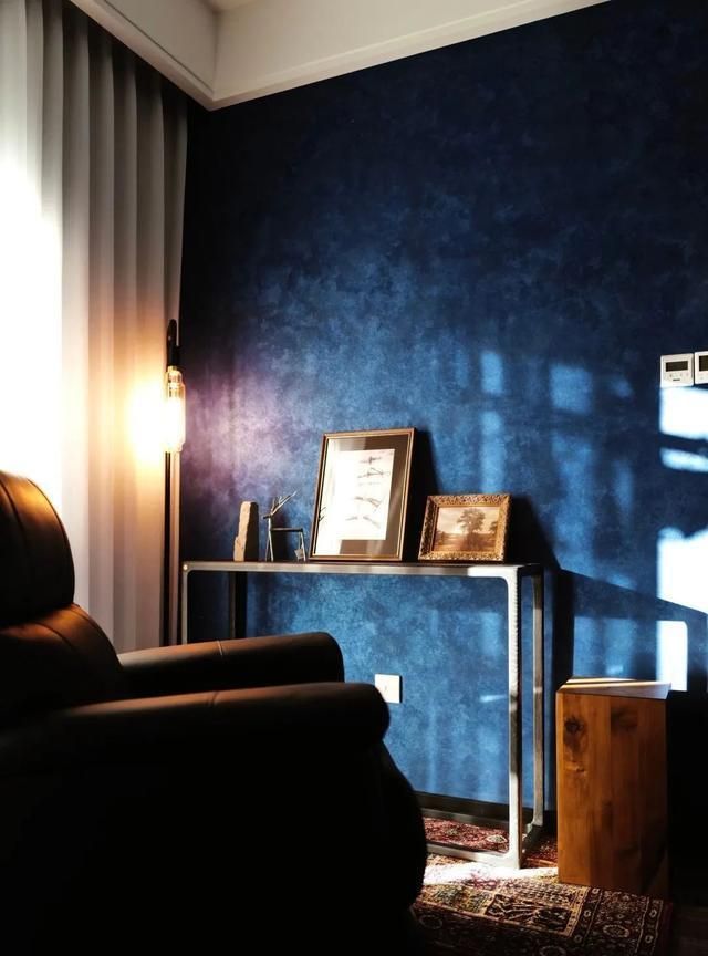 书房作为阅读还有思考的场所,设计的时候主要想打造成一个比较隐蔽又幽静深沉的色调。所以墙面刷上深蓝色的艺术漆,同样在阳光或者在灯光的折射下,颜色也各有不同。还有微微的珠光,太喜欢啦!