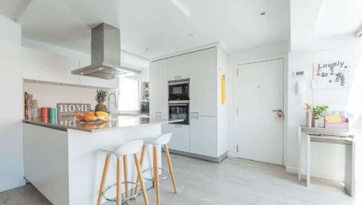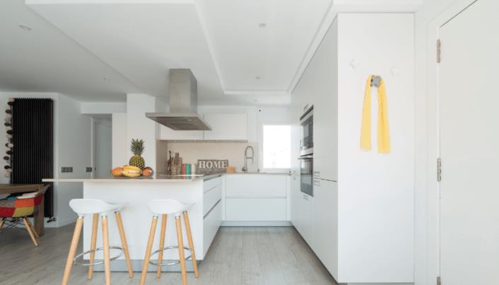 家里进门就是厨餐厅,U型橱柜从储物和操作空间上都能满足业主一家人的需求,大部分的厨具全都收进柜子里,就连家电也都选择嵌入式,显得整个厨房干净整洁,空无一物。