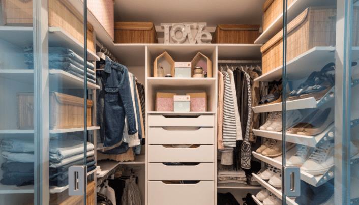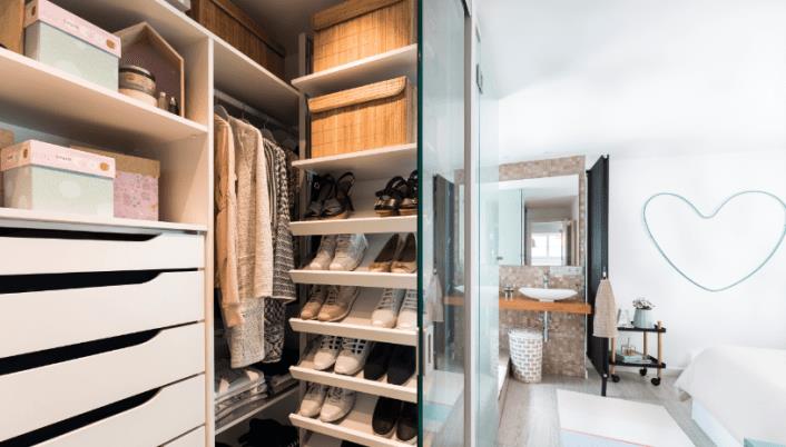 床的左侧有个步入式衣帽间,鞋子,衣服和包包全都放在指定区域,U型空间设计,右边挂衣服,右边挂鞋子,中间增加抽屉放些小衣服,顶部够不到的地方,可以收纳换季衣服。