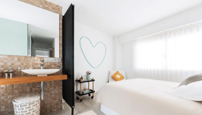 卧室是极简风格,全白色调看起来整个空间干净明亮,一辆小推车作为收纳平台,使用灵活,想要拉到哪儿都可以。