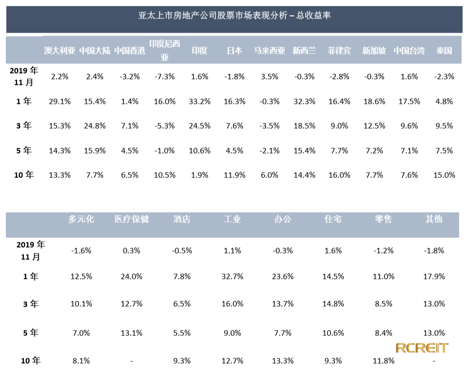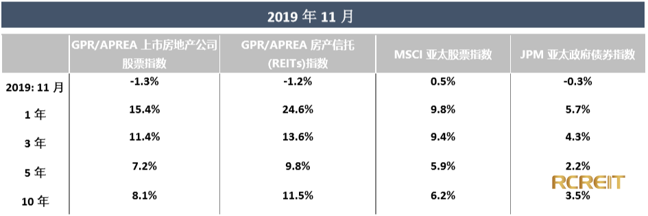 2019年11月, 中国大陆和马来西亚上市的房地产公司股票分别在市值较大市场和中小型的市场中表现突出,澳大利亚及马来西亚REITs表现最佳。在一年的时间范围内,工业资产类别在所有物业类别中表现最佳。