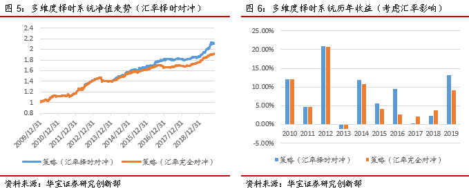 在实际投资中,资产配置的比例变化不可能从0到1,更多的是逐级增减仓,因此我们基于2.2的择时系统(即基于基本面、动量和汇率的多维度择时系统),构建分仓位交易的择时系统。具体来看,我们将仓位分为3档,[0,4)分配置20%中资美元债指数,[4,6)分配置50%,6分以上配置75%,剩余仓位配置长期纯债型基金指数,同时根据汇率情况选择配置的中资美元债指数是否进行汇率对冲,测试时间从2010年1月至2019年10月,手续费率设置为双边千分之一,基准指数采用50%中资美元债指数+50%长期纯债型基金指数,测试结果如下: