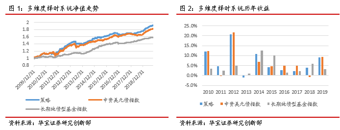 具体来看,我们在多维度择时系统的基础上增加美元兑人民币择时因子,将汇率作为原有系统的加分项,即当美元兑人民币为上行趋势时,在原有系统额外增加5分,那么综合择时系统的分值在0~15之间,信号生成为当综合打分大于6分时为看多信号,满仓配置中资美元债,当打分低于4分时为看空信号,满仓配置长期纯债型基金指数,当分值位于4~6分之间时延续上期信号。另一方面,根据汇率趋势信号选择配置的中资美元债是否进行汇率对冲,当美元兑人民币趋势上行时配置汇率未对冲的中资美元债指数,反之趋势下行时配置汇率完全对冲的中资美元债指数。测试时间从2010年1月至2019年10月,手续费率设置为双边千分之一,测试结果如下: