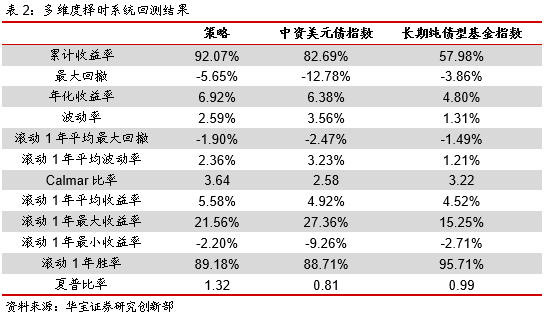 测试结果表明,多维度择时系统择时收益好于单指标,并且年化收益达到6.92%,较中资美元债指数6.38%有所提升,但风险明显减小,最大回撤由12.78%降低至5.65%,平均最大回撤由2.47%降低至1.90%,收益风险比达到3.64,与长期纯债型基金指数相比,年化收益提升显著,虽风险有所扩大,但是收益风险比有所提高,因此,中资美元债的配置能一定程度提高仅投资于国内债市的固收组合的收益。