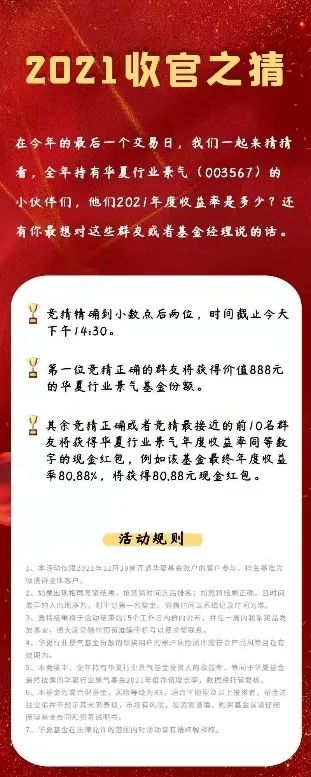 2021年最后一个交易日,华夏行业景气入选权益类基金年度榜单的热帖,让华夏微信群内冬日里掀起盛夏热浪,大量群友轮番竞猜,持有这只代号003567基金的持有人的年度收益率,究竟会定格在哪四位数字上?